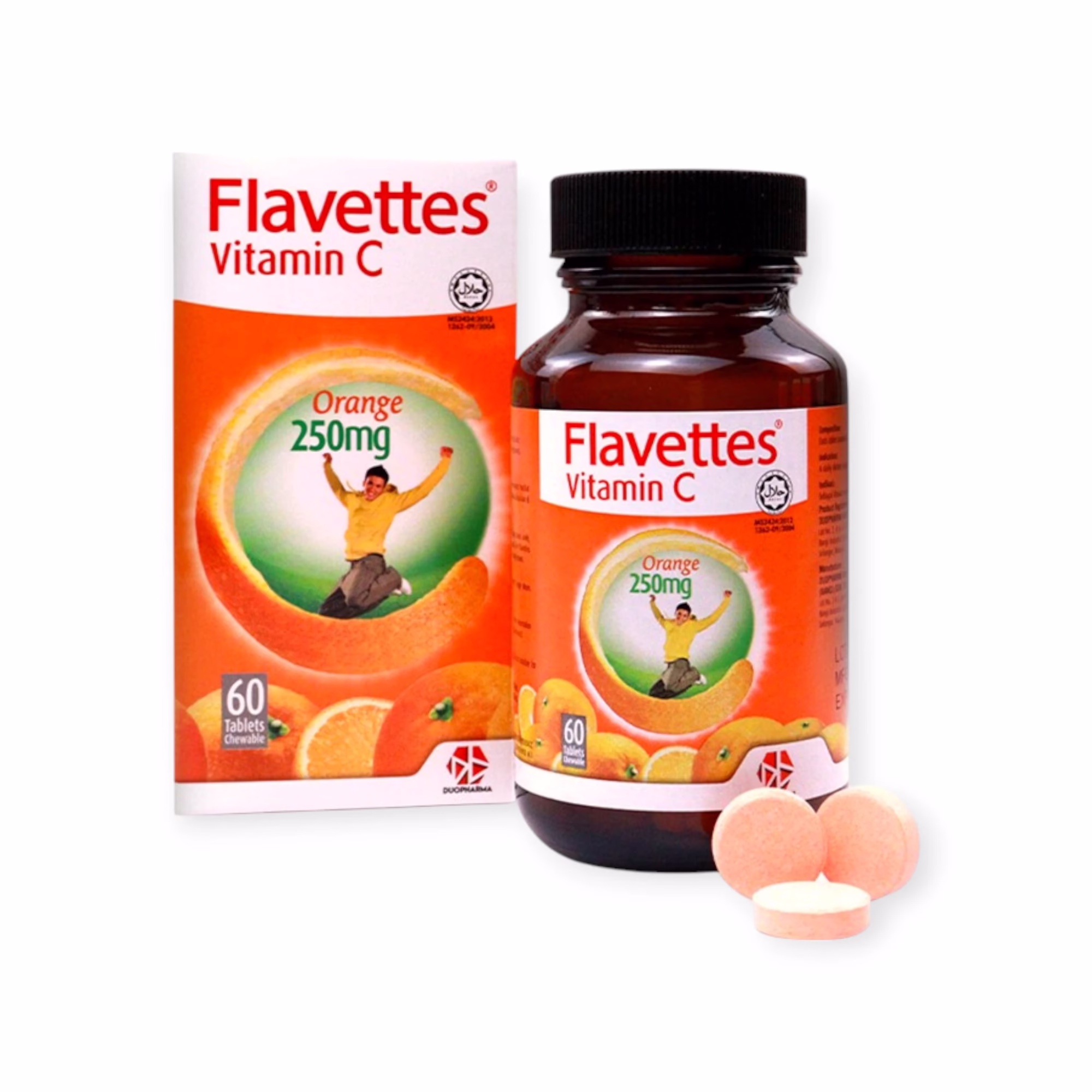 Flavettes Vitamin C Orange 250mg Chewable (60 Tablets) – Suplemen vitamin C dalam bentuk tablet kunyah dengan rasa oren yang menyegarkan. Membantu menyokong sistem imun, meningkatkan kesihatan kulit, dan melindungi sel daripada radikal bebas.